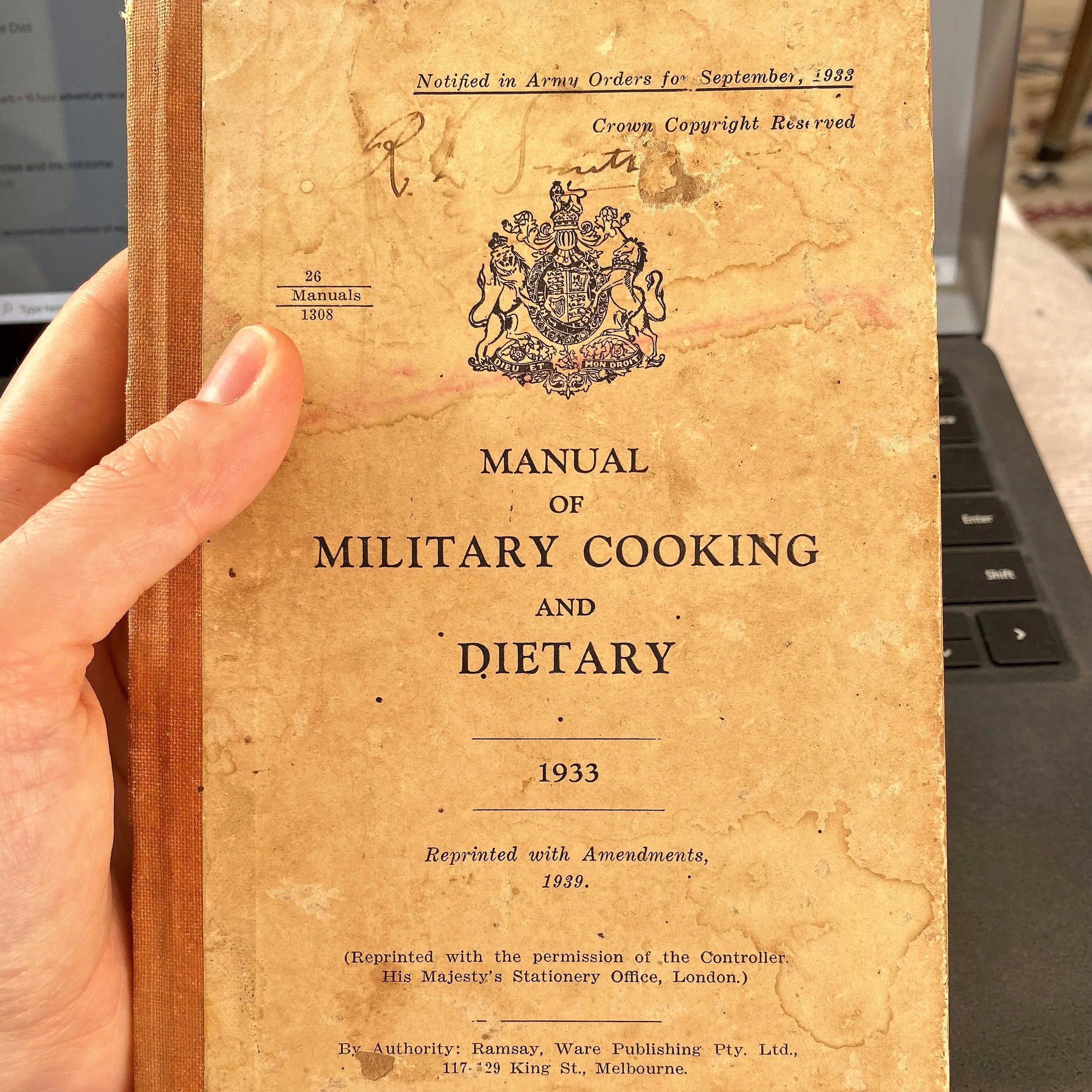 With Anzac Day just gone, I was motivated to do some further research into my family’s military history and during which I came across a copy of the Manual of Military Cooking and Dietary 1933.